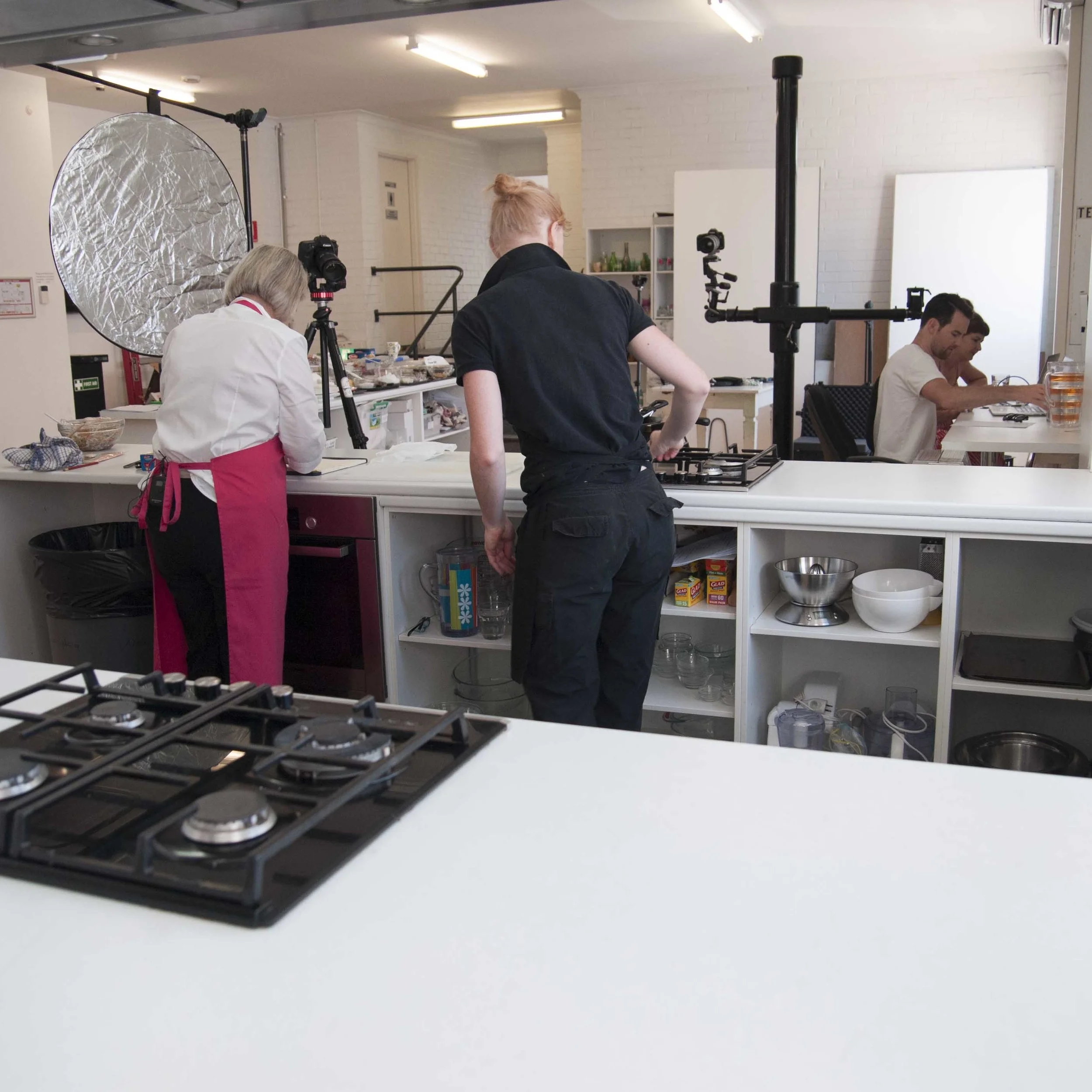 The open plan kitchens are used for testing of recipes before publishing and for the often quoted "here's one we prepared earlier" supplies to the studio kitchen. The kitchen workspaces are regularly used for both video and still photography content